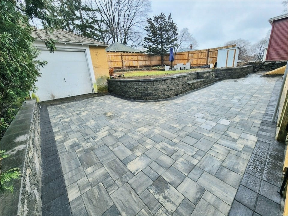 Patio and retaining wall with seating area